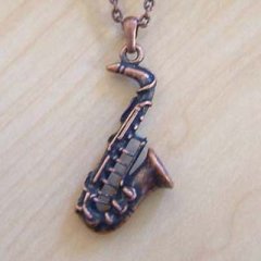 サックスのチャームが付いたペンダントのシルバー(写真左)。