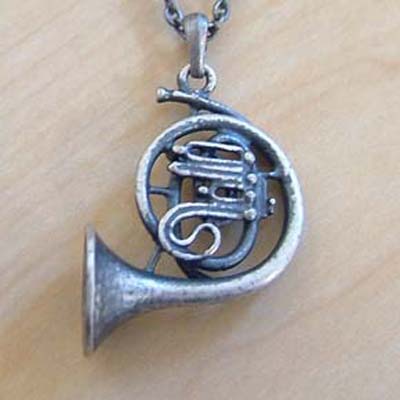 ホルンのチャームが付いたペンダントのアンティークシルバー。