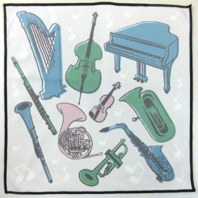 優しい色合いで楽器が描かれているマイクロファイバー楽器拭き。
